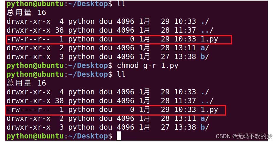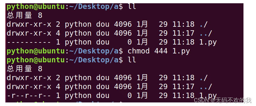 注意:chmod 444 1.py 中的第一個4代表用戶,第二個4代表用戶組,第三個4代表其它用戶