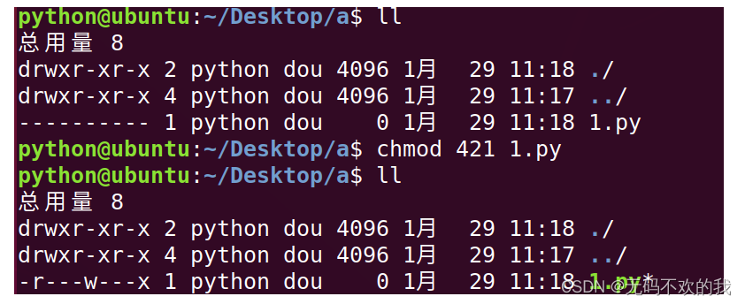 注意:chmod 421 1.py 中的4代表用戶權(quán)限,2代表用戶組權(quán)限,1代表其它用戶權(quán)限