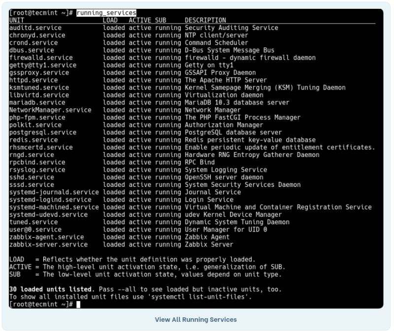 保存文件中的更改并關(guān)閉它。從現(xiàn)在開始,使用“running_services”命令查看服務(wù)器上所有已加載、正在運(yùn)行的服務(wù)的列表。