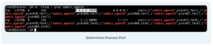 # netstat -ltup | grep zabbix_agentdOR# ss -ltup | grep zabbix_agentd第五列顯示套接字:Local Address:Port。在這種情況下,進(jìn)程 zabbix_agentd 正在偵聽端口 10050。