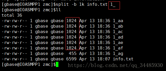按文件大小切分 每個(gè)1K(也可以選擇‘M’‘G’‘T’等)執(zhí)行split -b 1k info.txt 結(jié)果如下,每個(gè)文件被均分為1K