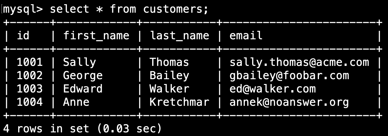 我們可以通過 select * from customers 命令來查看客戶表的內容。 輸出應該是這樣的: