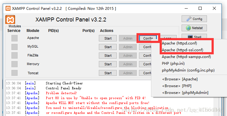配置好后點(diǎn)擊保存,返回到主頁面,接下來修改程序下的配置文件,點(diǎn)xampp后的config,需要注意的是80端口及443端口需要分別設(shè)置。
