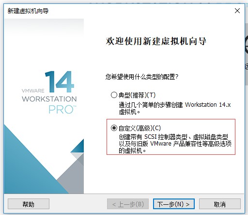 二、在選擇虛擬機配置界面選擇“自定義(高級)”選項,然后點擊“下一步”