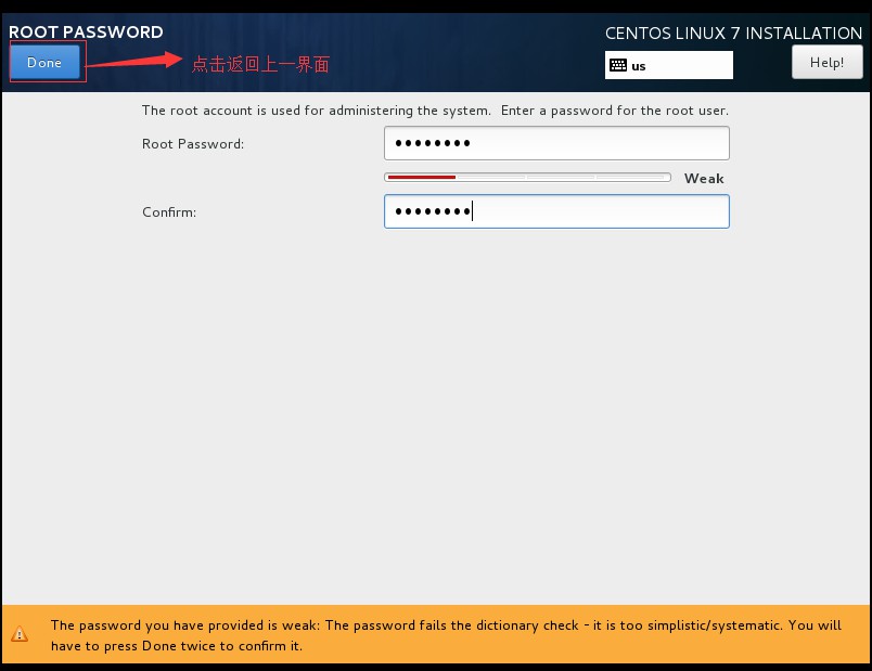 二十一、給root用戶創建密碼,然后點擊左上角的“Done”按鈕返回上一界面: