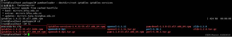 # 安裝yum-utils軟件,--destdir指定目錄, 最后面指定需要安裝的包名yumdownloader --destdir=/root iptables iptables-servicescd /rootls