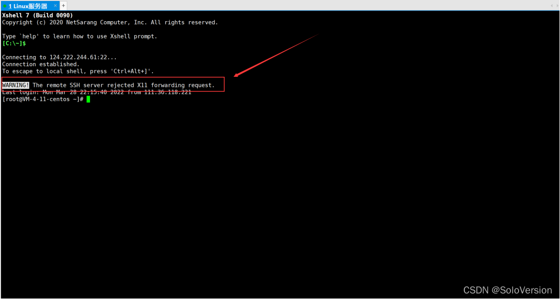 7. 上圖出現了一個警告“The remote SSH server rejected X11 forwarding request.”意思是“遠程SSH服務器拒絕X11轉發請求。”