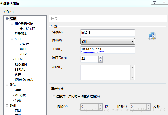 (2)主機欄里填入linux虛擬機的ip地址(就是第三步的ADDR),其他那要求填寫。點擊確定