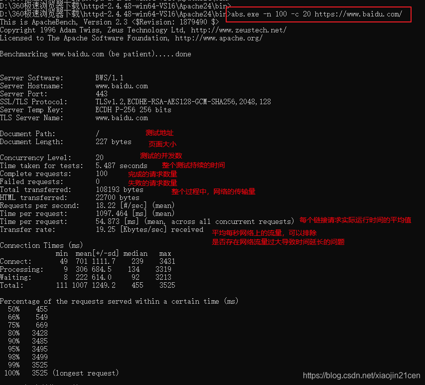 對百度進(jìn)行簡單的壓力測試: abs.exe -n 100 -c 20 https://www.baidu.com/