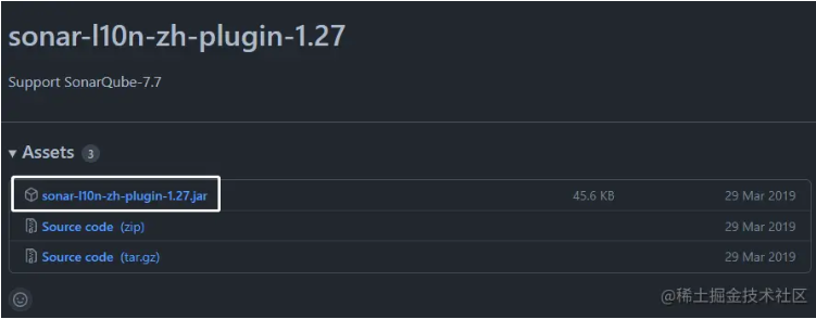 這就需要我們去網上找中文包:github.com/xuhuisheng/…在該頁面可以看到版本對應關系:即本次 7.7版本的SonarQube 對應的是 1.27 的中文安裝包。