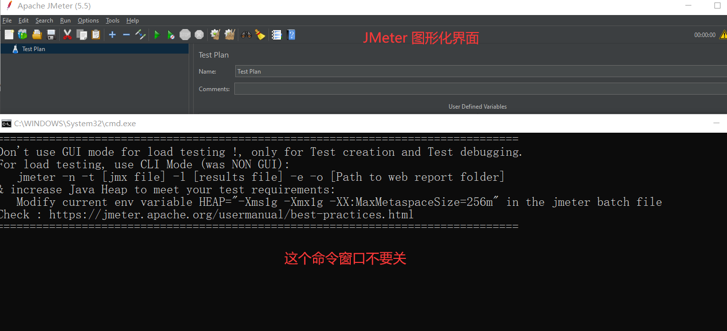 打開后JMeter會出來圖形界面和命令窗口,注意命令窗口不要關