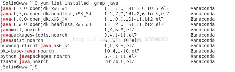 因為我安裝的CentOS7.4系統自帶jdk1.8,所以為了演示如何安裝jdk,我需要先卸載系統自帶的jdk