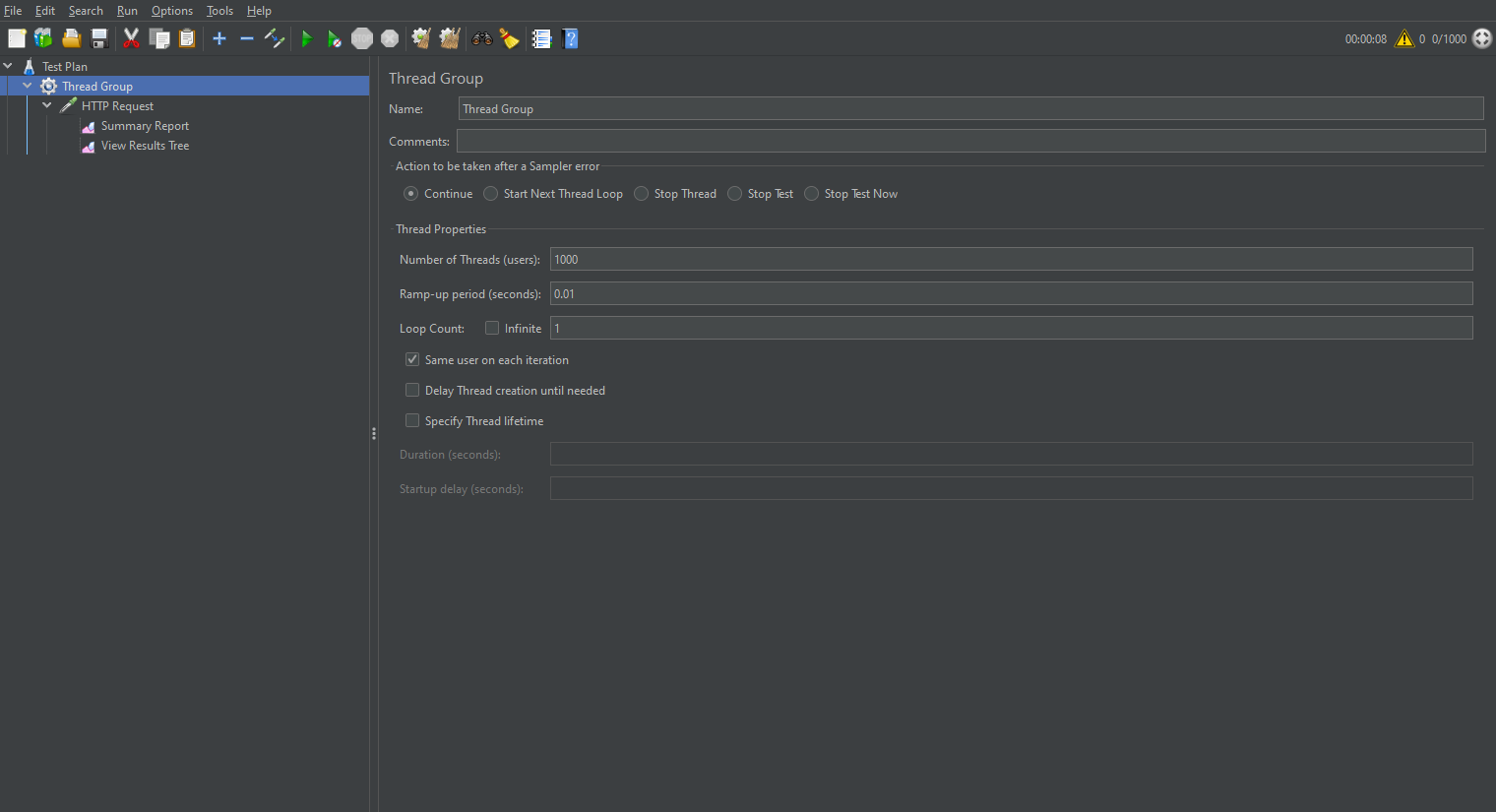 創建一個線程組,我這設置了1000個線程數,時間設為0.01秒