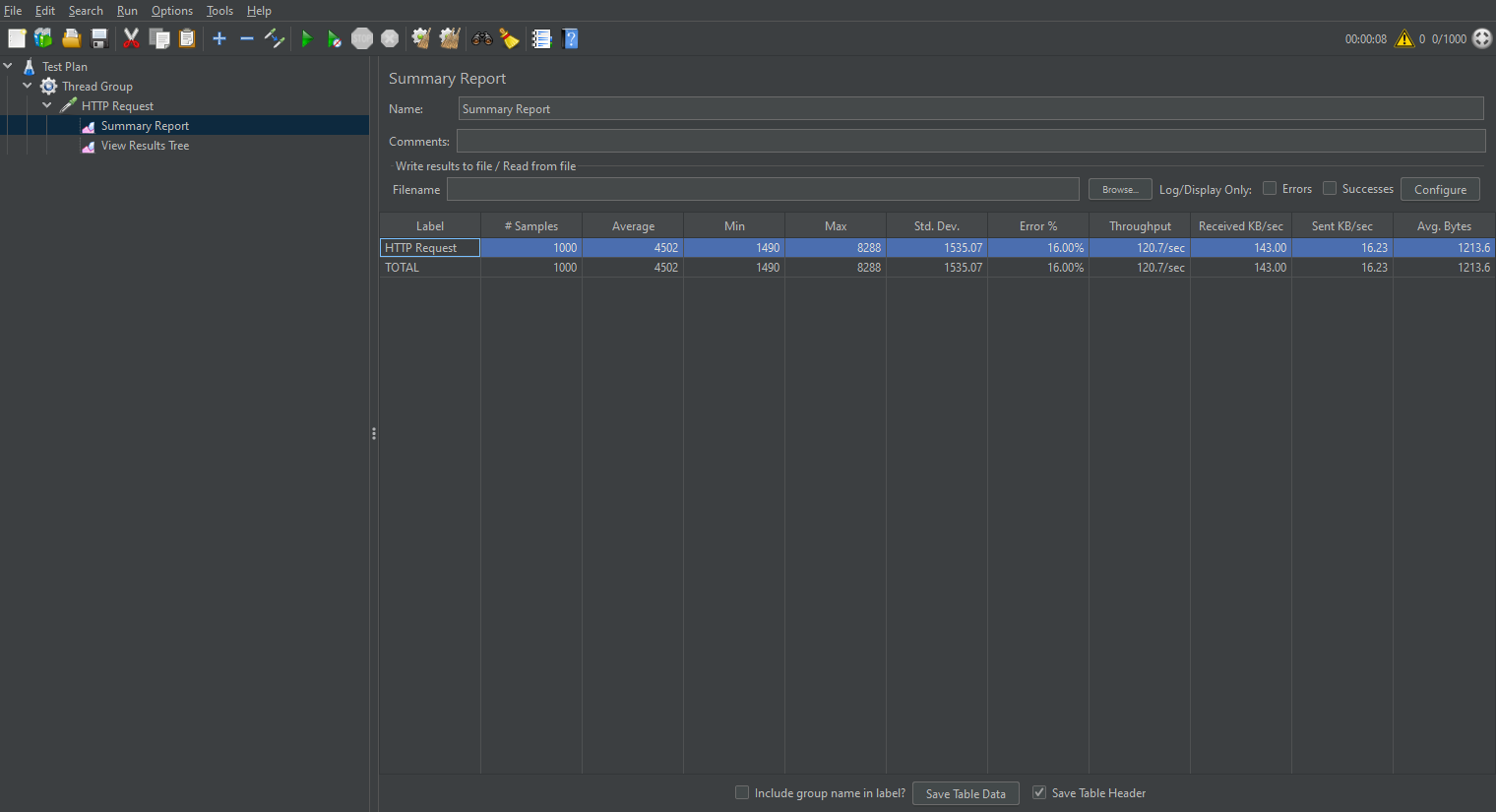 測試結果顯示,請求失敗率為16%,因此我這小破服務器,基本上1000個并發請求都難以滿足。