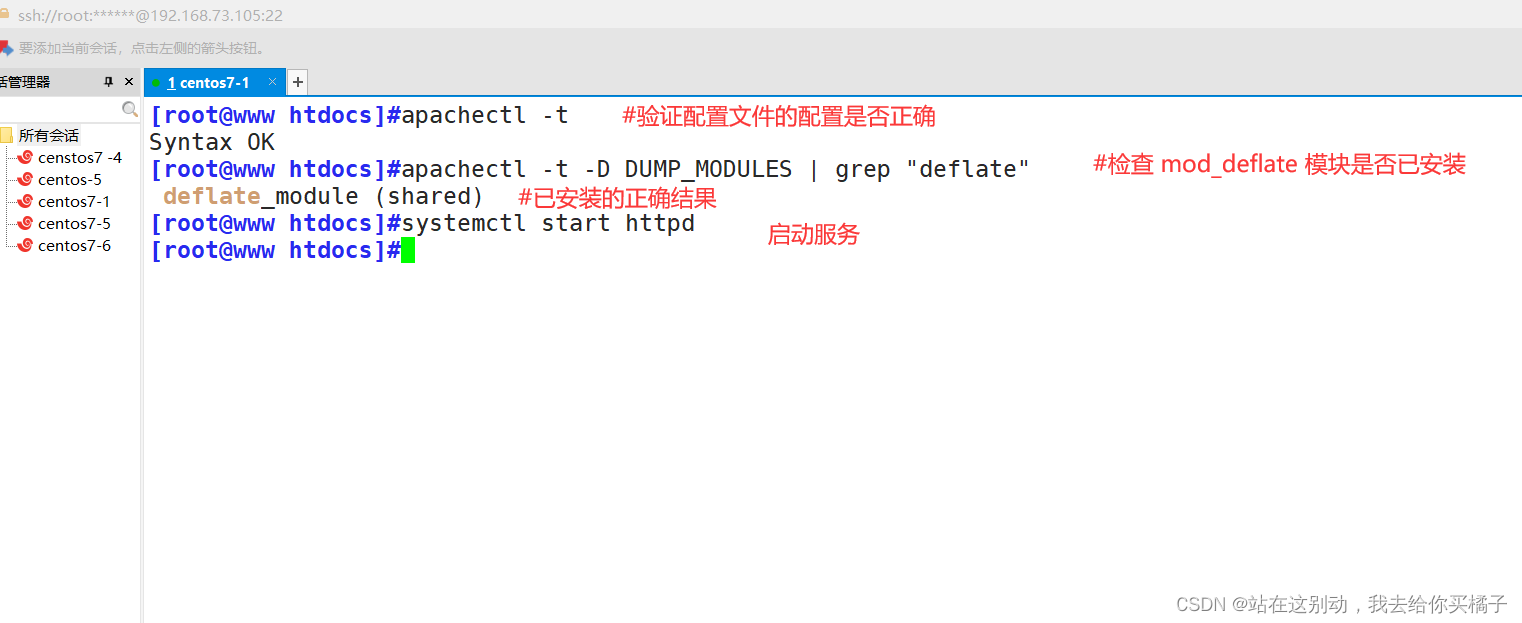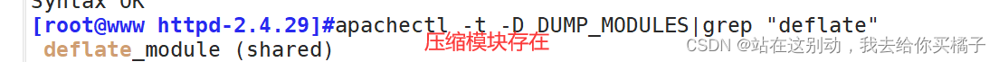[root@www htdocs]#apachectl -tSyntax OK[root@www htdocs]#apachectl -t -D DUMP_MODULES | grep "deflate" deflate_module (shared)[root@www htdocs]#systemctl start httpd
