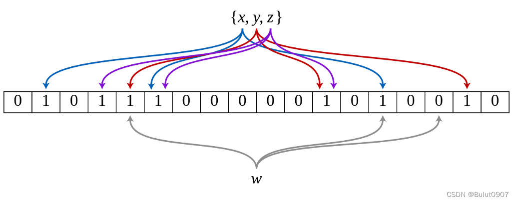 下圖所示出一個m=18, k=3(m是該Bit數組的大小,k是Hash函數的個數)的Bloom Filter示例。集合中的x、y、z三個元素通過3個不同的哈希函數散列到位數組中。當查詢元素w時,通過Hash函數計算之后因為有一個比特為0,因此w不在該集合中