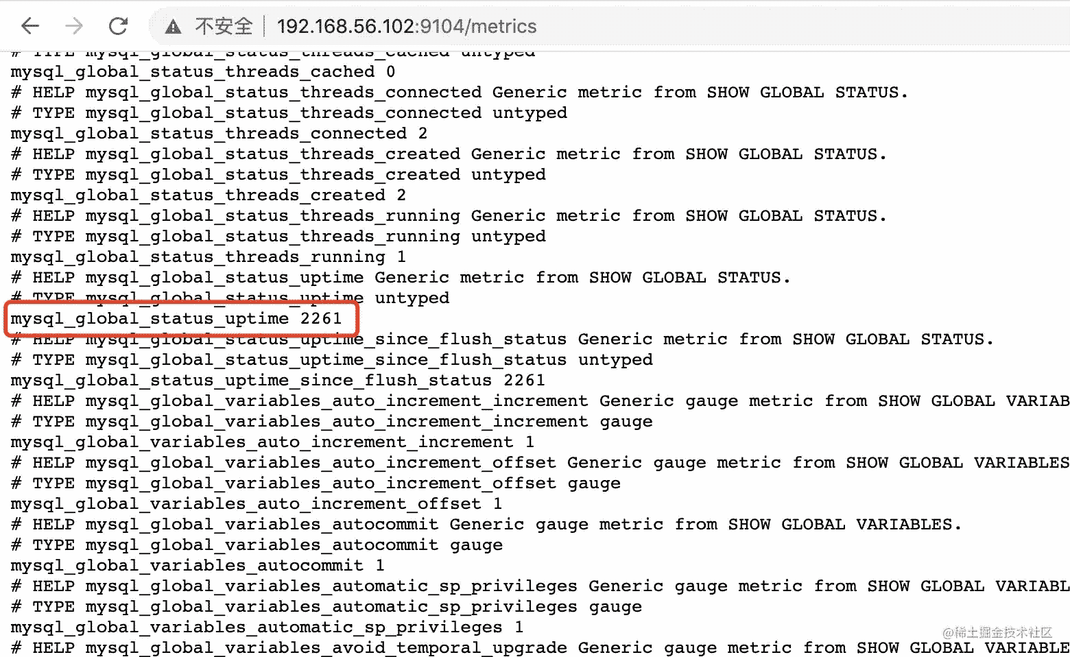 啟動完成之后,我們可以通過訪問 mysqld-exporter 服務http://192.168.56.102:9104/metrics 查看 mysqld-exporter 采集了 MySQL 的哪些 metrics 數據,比如下圖中的 mysql_global_status_uptime 指標表示 MySQL Server 啟動了多長時間,單位是秒。
