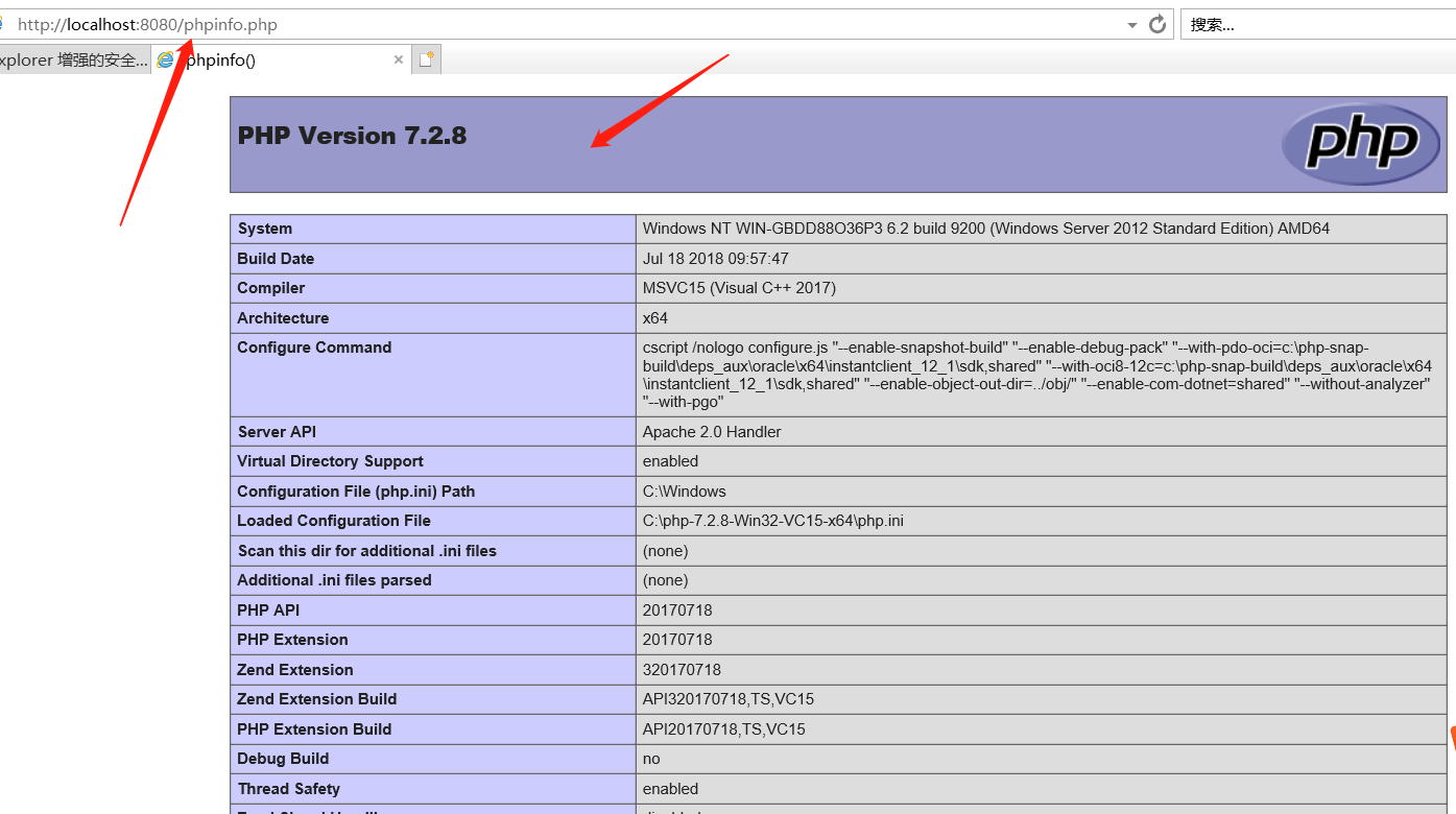 打開瀏覽器,訪問http://localhost:8080/phpinfo.php,出現PHP配置界面
