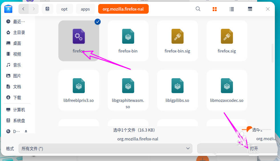 在彈出的窗口中找到瀏覽器的可執行文件,這里以firefox為實例。