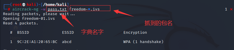 -w:指定抓去握手包的存放位置或者名字,freedom是一會抓去的握手包的名字