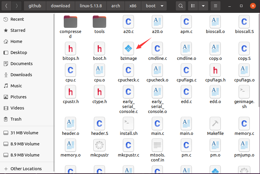 編譯好的內核文件在arch文件夾相應的架構文件夾下面,如下圖所示: