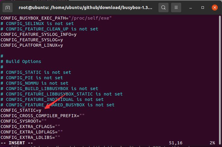 2、編譯busybox與編譯內核步驟基本一致,將下載好的壓縮包進行解壓,然后進入文件夾中,使用make defconfig配置默認編譯選項,這里需要注意的是,在生成的.config配置文件中,需要設置CONFIG_STATIC=y,如果沒有,添加即可,如下圖所示: