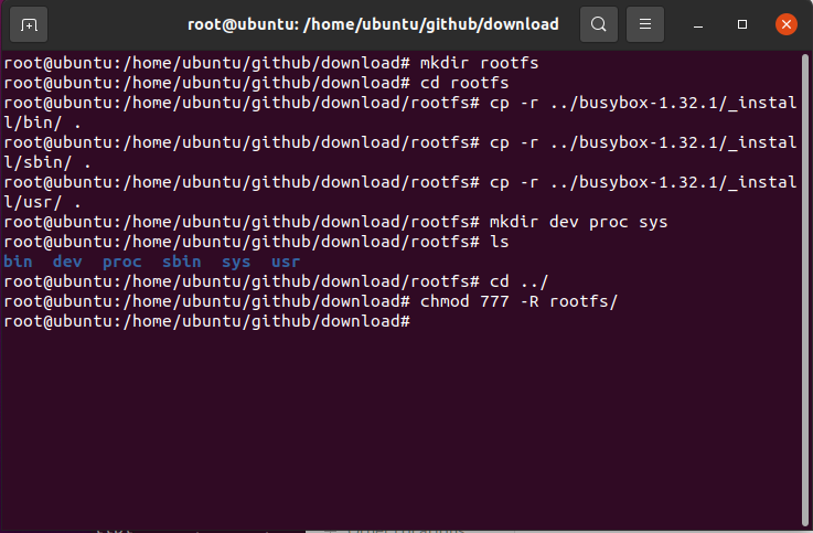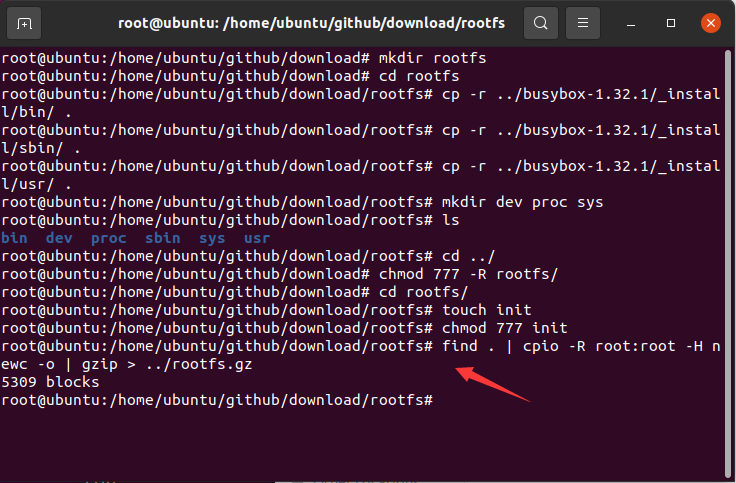 5、最后利用命令find . | cpio -R root:root -H newc -o | gzip > ../rootfs.gz將文件系統打包,至此,一個文件系統就創建完成了,如下圖所示: