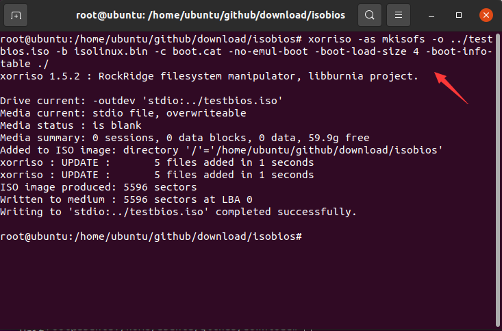 4、最后,在isobios文件夾下面使用命令xorriso -as mkisofs -o ../testbios.iso -b isolinux.bin -c boot.cat -no-emul-boot -boot-load-size 4 -boot-info-table ./生成iso鏡像文件,如下圖所示: