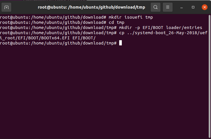 1、uefi這里采用system-boot和syslinux配合來制作,首先,創建兩個文件夾isouefi和tmp,其中,isouefi用來掛載設備,tmp文件夾用來臨時存放文件以計算大小,然后在tmp文件夾下面創建EFI/BOOT和loader/entries目錄,接著,將解壓后的systemboot下面的uefi_boot/EFI/BOOT/BOOTx64.EFI文件拷貝到tmp/EFI/BOOT目錄下面,如下圖所示:
