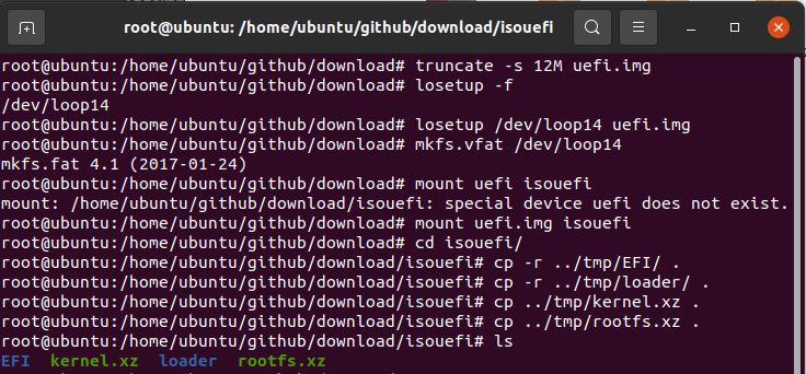 3、此時就可以根據tmp文件夾的總大小創建一個相同大小的img文件了,這里的tmp是11M,為了穩妥起見,這里創建一個12M的img文件,命令為truncate -s 12M uefi.img,然后使用losetup -f命令尋找一個當前未使用的邏輯設備,然后使用losetup命令將我們前面創建的img文件虛擬成改邏輯設備,接著利用mkfs.vfat將該設備格式化成vfat系統,接著使用mount命令將其掛載到isouefi文件夾下面,最后將tmp文件夾下面所有文件及其文件夾拷貝到isouefi目錄下面,如下圖所示: