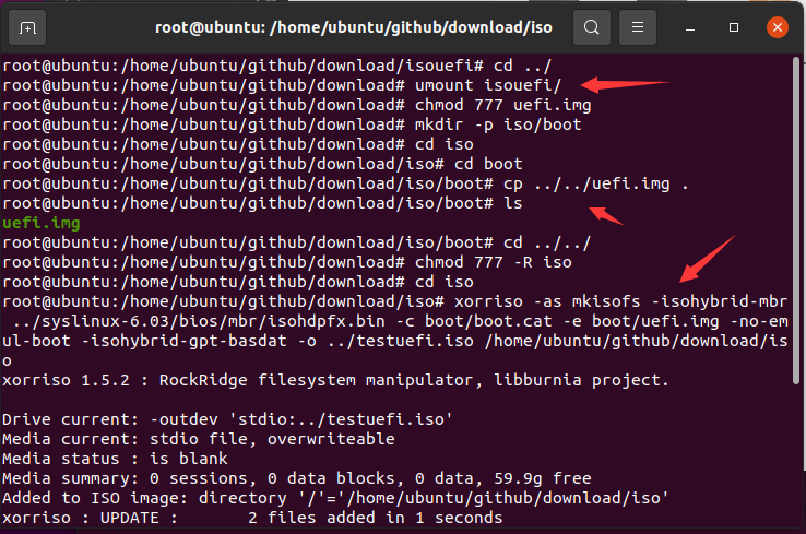 4、接著利用umount命令取消掛載,這樣我們就得到一個包含內核、文件系統等的img文件,接著創建一個iso文件夾,并且在該文件夾下面將創建一個boot文件夾,然后將img復制到iso/boot下面,最后利用xorriso工具生成iso文件即可,如下圖所示: