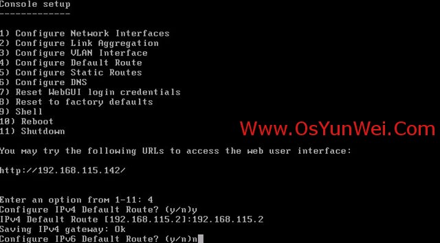 4)配置默認(rèn)路由:用來設(shè)置默認(rèn)網(wǎng)關(guān)的IPv4或IPv6。出現(xiàn)提示時(shí),輸入默認(rèn)網(wǎng)關(guān)的IP地址。