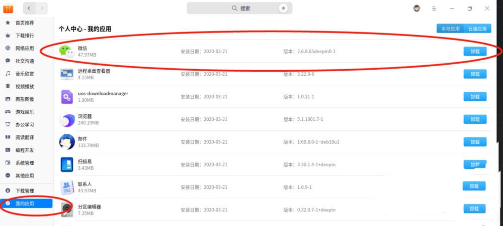 6、點擊應用商店,我的應用,可以看到微信已經安裝好了,同時也可以看到已經安裝的程序。