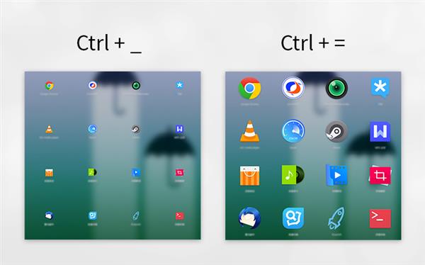 在高分屏設備上,系統會自動適配一個最合適的圖標大小;在普通設備上,可以自由地通過快捷鍵和滾輪(Ctrl =/- 或Ctrl+滾輪)對圖標進行縮放。