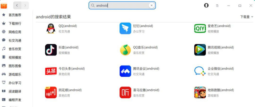 打開統信 UOS 系統應用商店,搜索“Android”,后綴有 (android) 即為安卓應用,或打開應用商店首頁底部《安卓同樣也精彩》專題,找到應用,點擊“安裝”即可。