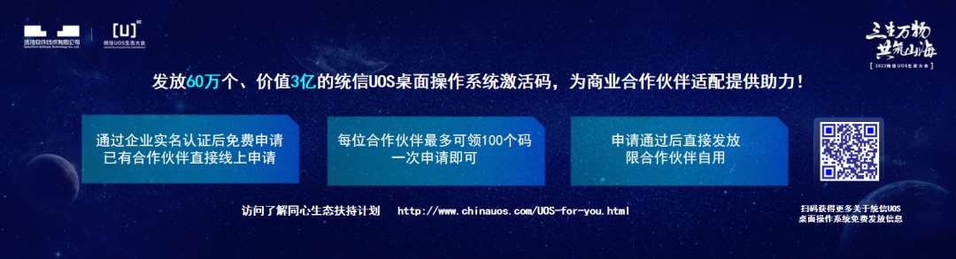 面向 B 端企業級市場,統信軟件正式發布服務器操作系統 UOS V20 免費使用授權版本,并推出同心生態扶持計劃,發放 60 萬個、價值 3 億的統信 UOS 桌面操作系統激活碼,為商業合作伙伴適配提供助力。