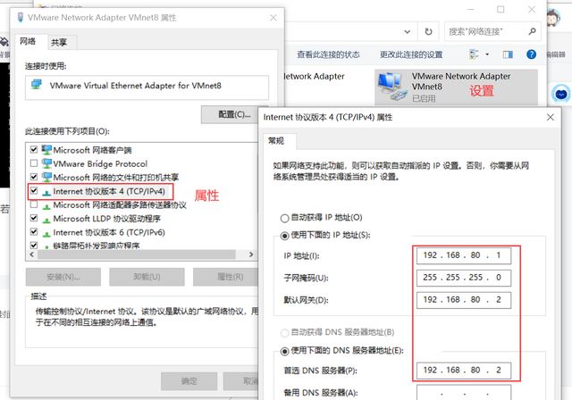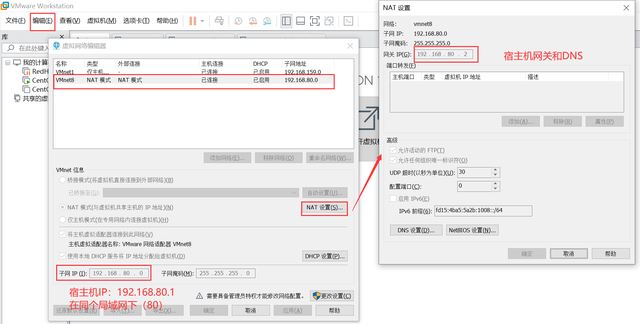 Windows虛擬網卡VMnet8的網關和DNS地址 和 VMWare虛擬網卡的網關和DNS地址一致。