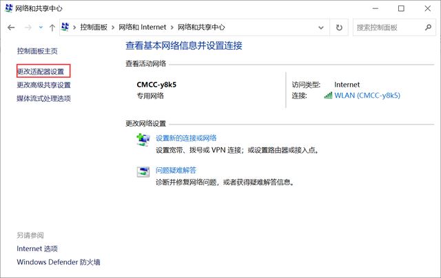 控制面板->網絡和Internet->網絡和共享中心->更改適配器設置