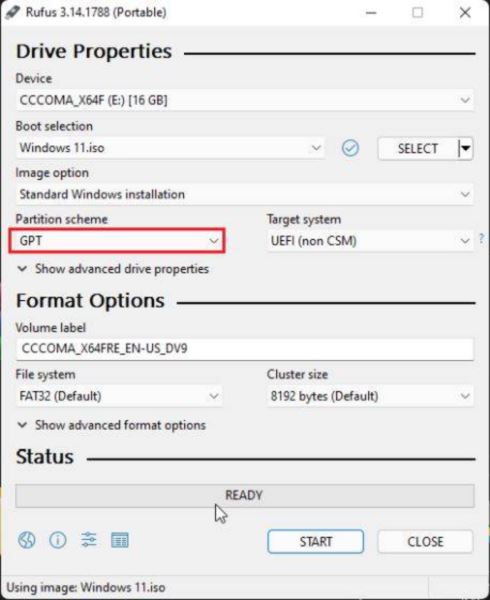 3. 所以在Rufus上,我在“分區方案”下選擇了“GPT ”。您需要相應地選擇分區方案。最后,保持一切默認,然后點擊“開始”。刷機過程完成后,關閉 Rufus 并將