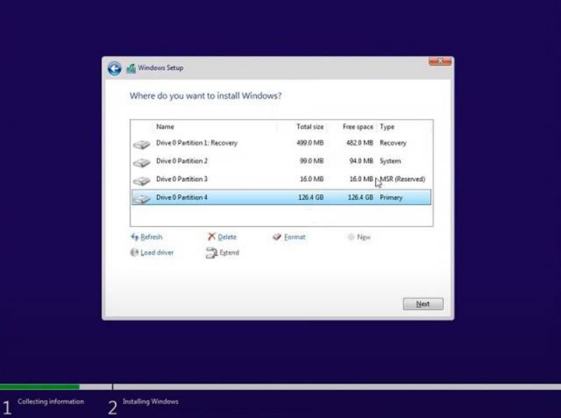 7. 進入分區頁面后,根據驅動器大小確定“C”驅動器,然后單擊“下一步”在您的 PC 上安裝 Windows 11。這只會擦除您的 C 盤,包括來自桌面、我的文檔、下載的程序和文件 – 都在 C 盤內,不會觸及其他分區。