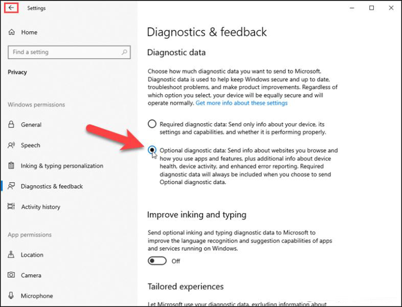 選擇可選診斷數據選項。然后,使用左上角的后退箭頭返回Windows 預覽體驗計劃屏幕。