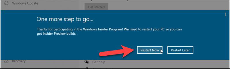 單擊立即重新啟動以完成注冊 Windows Insider Build。