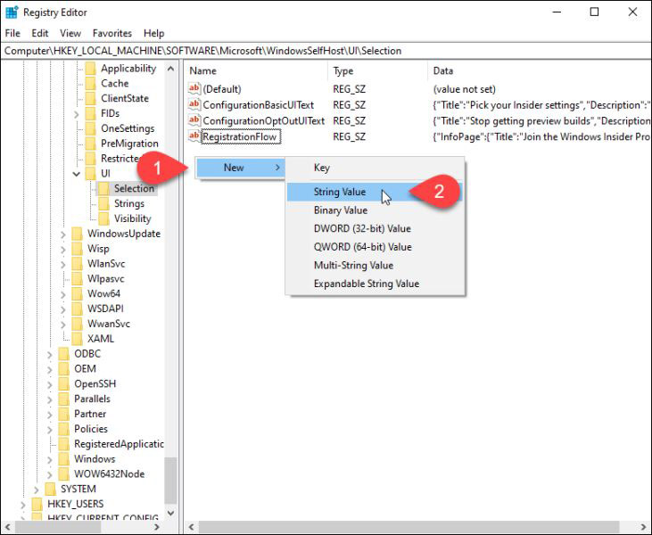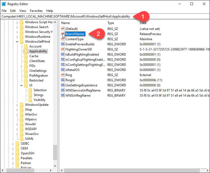 HKEY_LOCAL_MACHINE\SOFTWARE\Microsoft\WindowsSelfHost\UI\Selection然后,雙擊右側的UIBranch。如果您在列表中沒有看到UIBranch,請參閱下面的創建它。