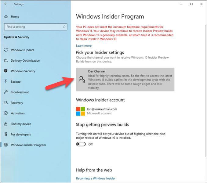 您應該在Pick your Insider settings下看到Dev Channel。