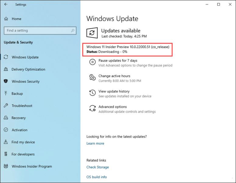要安裝 Windows 11預覽版,請返回“設置”>“更新和安全”中的“ Windows 更新”屏幕。更新應自動開始下載。