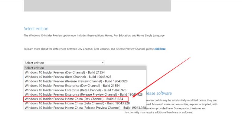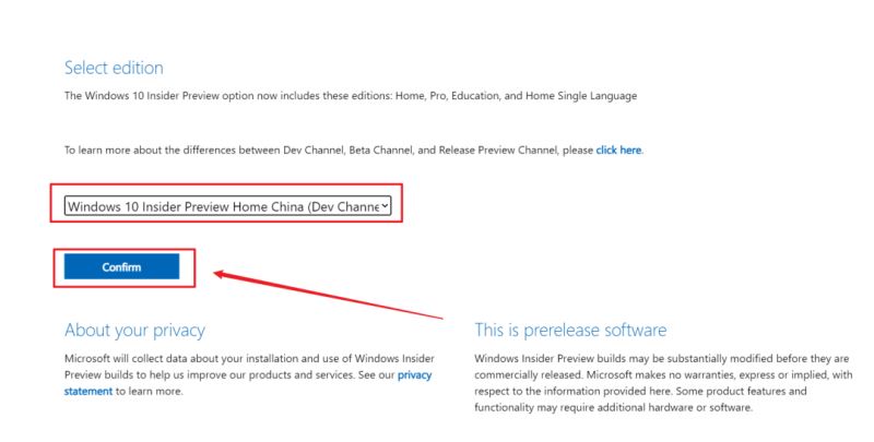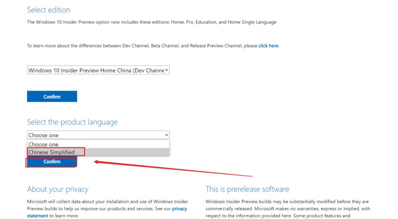 打開鏈接后,在網(wǎng)頁(yè)末尾可以選擇下載的系統(tǒng)的類型。在這里建議選擇【W(wǎng)indows10 Insider Preview Home Chine(Dev Channel )-Build】選好了之后點(diǎn)擊【Confrim】: