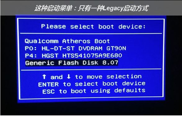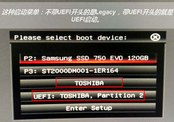 第二步:找到要啟動(dòng)的U盤,并辨別UEFI和Legeacy方式