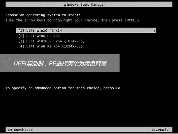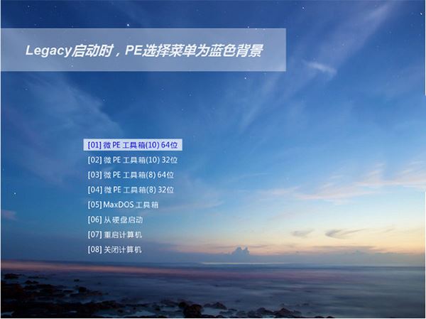 3、選中需要啟動(dòng)的U盤選項(xiàng),繼續(xù)敲回車之后,均會(huì)先進(jìn)入PE版本選擇界面。但以不同的方式進(jìn)入,顯示的PE選擇界面是不同的。Legacy啟動(dòng)時(shí),PE選擇菜單為藍(lán)色天空背景。UEFI啟動(dòng)時(shí),PE選擇菜單為黑色純色背景。