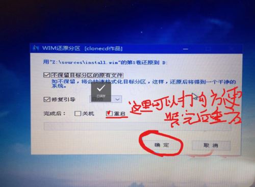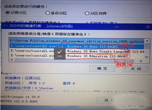 10、返回到桌面打開CGI備份還原,選中C盤,然后在下面選擇瀏覽鏡像,在U盤里面找到系統(tǒng),例如途圖中我選擇的是Win10 家庭版,選擇好版本后點(diǎn)擊確定,建議大家把完成后重啟打勾,裝完后直接就會(huì)進(jìn)入新的系統(tǒng)了,就相當(dāng)于你剛買的新電腦開機(jī)那樣的界面
