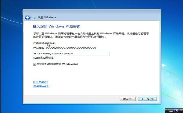 第九步:輸入產品密鑰(自行在網上搜索),輸入后點擊下一步;